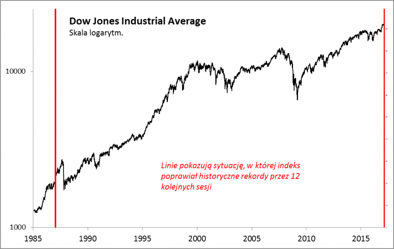 Ledwie opublikowaliśmy obszerną analizę poświęconą kontrowersyjnej analogii z końcówką lat 90., a już pojawił się kolejny pretekst do sięgnięcia po historyczne ciekawostki. Jak rozpisywały się media, w poniedziałek amerykański indeks Dow Jones Industrial Average po raz dwunasty z rzędu poprawił historyczny rekord (we wtorek seria została przerwana). Tak długa seria nieprzerwanego bicia rekordów z sesji na sesję zdarzyła się na przestrzeni ostatnich 40. lat do tej pory tylko jeden raz: 20 stycznia 1987 roku.