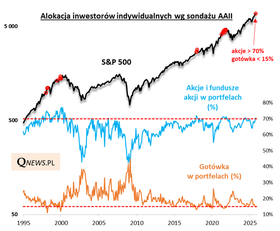Nawet jeśli rozszerzymy badany okres z kilkunastu lat na trzy dekady, to widać, że taka kombinacja omówionych sygnałów - udział akcji powyżej 70 proc., a udział gotówki poniżej 15 proc. - nie zdarzała się często. Oprócz wspomnianych przypadków z lat 2021 i 2018 wcześniej taka sytuacja miała miejsce w końcowym etapie bańki internetowej (1999-2000) oraz w 1998 (w trakcie wspinaczki poprzedzającej tąpnięcie związane z kryzysem rosyjskim).