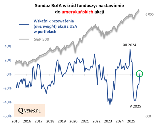 Na koniec jeszcze ciekawostka dotycząca nastawienia funduszy do akcji amerykańskich. Przypomnijmy, że na przestrzeni ostatnich kilkunastu miesięcy obserwowaliśmy tu gwałtowne, wręcz bezprecedensowe wahania rynkowego "sentymentu" i związanej z tym narracji. Najpierw w końcówce 2024 zarządzający byli rekordowo przeważeni w akcjach z USA (względem innych rynków), bo wierzono w cudowne skutki nadchodzących rządów administracji Trumpa. Potem w maju br., po zaszokowaniu inwestorów zapowiedziami drakońskich ceł, sytuacja odwróciła się o przysłowiowe 180 stopni - amerykańskie aktywa zostały znienawidzone.