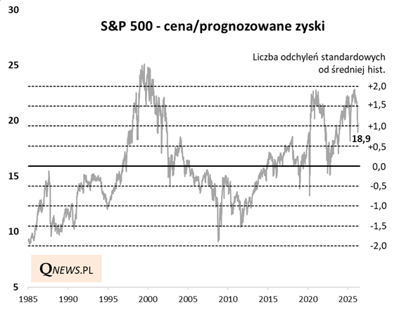 Pewien postęp widać też, jeśli chodzi o wyceny amerykańskich blue chips, na których wysoki poziom narzekałem w trakcie ubiegłego roku. Wskaźnik ceny do prognozowanych zysków spółek z S&P 500, który jeszcze niedawno ocierał się o 2 odchylenia standardowe powyżej wieloletniej średniej, na koniec ubiegłego tygodnia zszedł poniżej jednego odchylenia od średniej. Innymi słowy dystans względem historycznej normy przepołowił się. P/E poniżej 19 nie widzieliśmy od kwietnia ub.r., czyli od wspomnianych już ceł Trumpa.