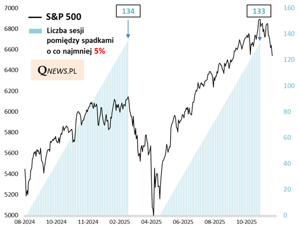 W końcówce października pisałem, że czas trwania zwyżki amerykańskiego S&P 500 bez co najmniej 5-procentowej korekty zrównał się z tym odnotowanym w lutym br. (czyli przed głęboką przeceną na Wall Street, której punktem kulminacyjnym była panika wywołana przez cła Trumpa). Nawet nie przypuszczałem wtedy, że fakt ten - na który nałożyły się inne sygnały, jak słynny "omen Hindenburga" - niemal idealnie zbiegnie się w czasie z wyznaczeniem szczytu giełdowego benchmarku przed nadciągającą korektą. Owa korekta właśnie sprowadziła S&P 500 o 5,1 proc. poniżej rekordu.