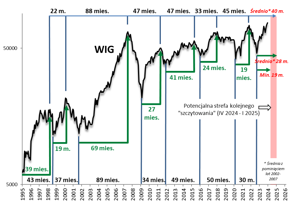 Gdyby cykl na polskim rynku rozgrywał się zgodnie z historyczną średnią, to szczytu WIG przed następną bessą należałoby oczekiwać dopiero na początku 2025 roku. Ale jeżeli wydarzenia ciągle będą przebiegać w przyspieszonym tempie, z jakim mamy do czynienia od pandemii, to termin szczytu może się znacznie przybliżyć, nawet na kwiecień 2024.