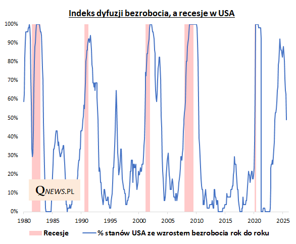 Nowe światło na jakże kluczową kwestię stanu rynku pracy rzucają opublikowane w piątek bardziej szczegółowe dane BLS na temat bezrobocia w poszczególnych amerykańskich stanach, na podstawie których obliczamy tzw. indeks dyfuzji. Mierzy on odsetek stanów, w których rośnie stopa bezrobocia (rok do roku). Jest to bardziej "wyrafinowane" podejście niż zagregowana stopa bezrobocia liczona dla całej gospodarki USA.