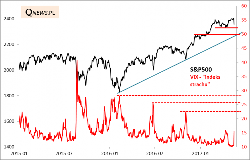 W takich sytuacjach standardowo zwracamy też uwagę na poziom wspomnianego "indeksu strachu". Już w środę wykonał on pokaźny ruch w górę ze skrajnie niskiego pułapu - w okolicę 15 pkt. Nie ma oczywiście pewności, że pójdzie jeszcze wyżej, ale trzeba przyznać, że jest to całkiem możliwe. Na przestrzeni ostatnich dwóch lat o dołkach głębszych korekt na rynku świadczyły odczyty VIX-a grubo przekraczające granicę 20 pkt. W trakcie największych obaw przed bessą - na jesieni 2015 - wskaźnik zawędrował powyżej 40 pkt.