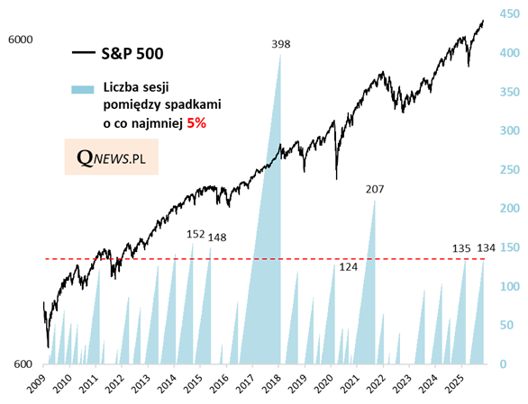 Pierwsza z ciekawostek dotyczy właśnie czasu trwania tej wspinaczki. Z naszych wyliczeń wynika, że od czasu ostatniej, co najmniej 5-procentowej przeceny indeksu S&P 500 minie dziś 135 sesji. Dokładnie tyle właśnie czasu trzeba było czekać na poprzednią większą przecenę, która miała miejsce w pierwszych miesiącach roku - tamta korekta nie poprzestała na stanowiących w tych obliczeniach kryterium 5 procentach spadku, lecz niemal otarła się o granicę bessy.