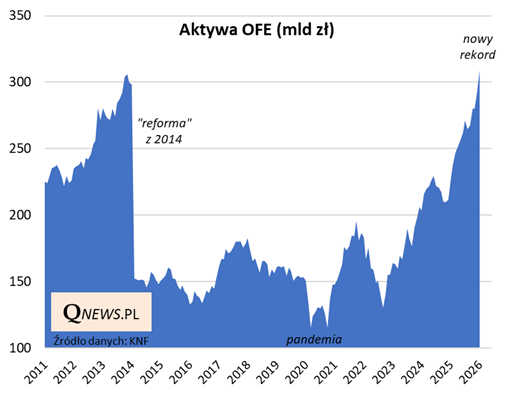 Wzrost wartości aktywów otwartych funduszy emerytalnych (OFE) w styczniu powyżej 310 mld zł oznacza pobicie rekordu sprzed pamiętnej "reformy" z 2014 roku, która odchudziła portfele OFE o obligacje skarbowe, które zostały umorzone w celu (chwilowego) zahamowania wzrostu długu publicznego.