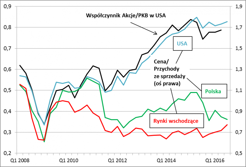 No dobrze, ale co z innymi rynkami? Niestety nie sposób o podobne szczegółowe dane statystyczne dla krajów np. Europy Zachodniej, a tym bardziej Polski i innych rynków rozwiniętych. Ale są pewne poszlaki. Omówiony współczynnik „akcje/PKB” jest w miarę nieźle skorelowany np. ze wskaźnikiem cena/przychody ze sprzedaży spółek z S&P500 (w jego przypadku dysponujemy jednak znacznie krótszą historią) – co pokazujemy na kolejnym wykresie. A skoro tak, to można sprawdzić, jak cena/sprzedaż wygląda na innych rynkach. Okazuje się, że według tego kryterium rynki wschodzące, a wśród nich Polska, są wyceniane nisko, czego nie da się powiedzieć o USA.