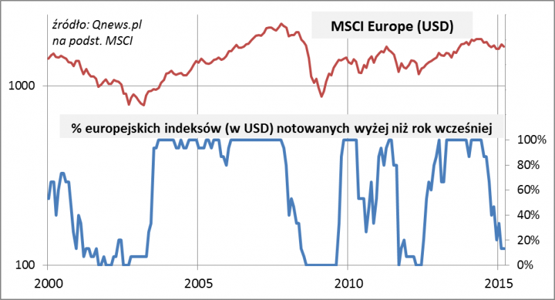 Jeśli weźmiemy te same indeksy, ale wyrażone w walutach lokalnych (głównie w euro, ale nie tylko), to okaże się, że statystyki wyglądają zupełnie inaczej. Zbiorczy MSCI Europe zgodnie z intuicją bije rekordy hossy, a 87 proc. europejskich indeksów krajowych notowanych jest wyżej niż rok wcześniej.