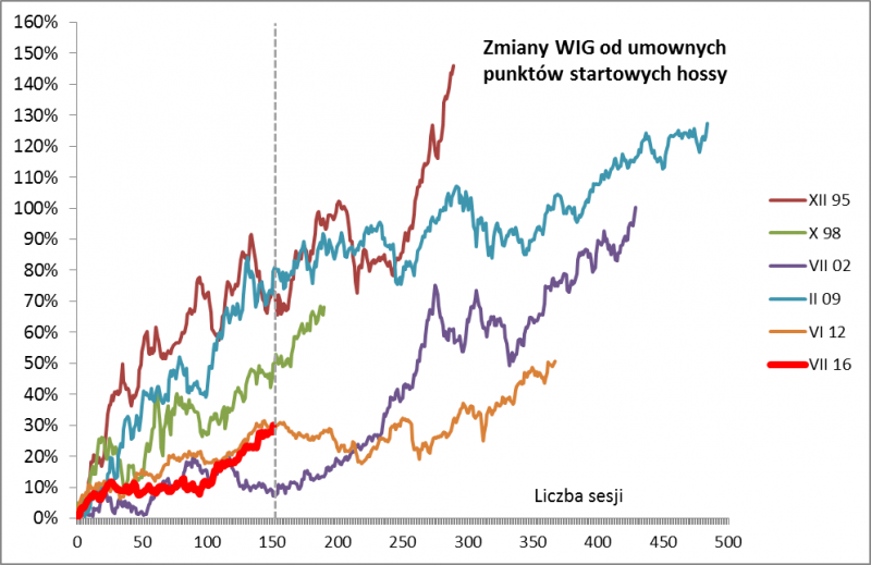 Sprawdźmy jak fala zwyżkowa trwająca umownie od lipca 2016 r. (nieco niżej położony był dołek ze stycznia 2016, ale I półrocze ub.r. trudno byłoby nazwać hossą) wygląda na tle historycznych rynków byka.
