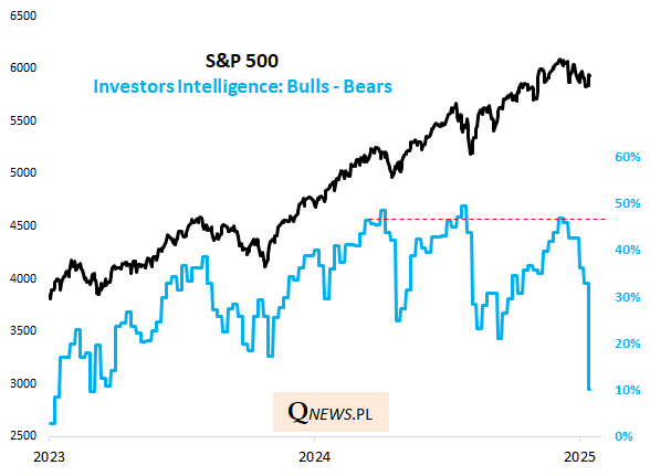 Reasumując, z jednej strony najnowszy odczyt wskaźnika Investors Intelligence przynosi dobrą wiadomość - relatywnie niewielka korekta na Wall Street wystarczyła, by schłodzić nastroje do poziomu niewidzianego od wiosny 2023 (a więc od wczesnego etapu obecnej fali hossy). Z drugiej pozostaje pewien niedosyt - ciągle trochę zabrakło do charakterystycznej kapitulacji optymistów (ale tego trudno się spodziewać po raptem 4-proc. zniżce S&P 500 - do tego potrzebny byłby dużo mocniejszy spadek).