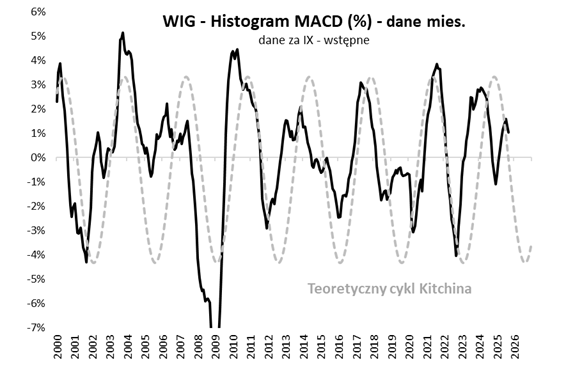 Jeśli już doszukiwać się jakichś sygnałów wczesnego ostrzegania, to znaleźć je można natomiast na wykresie tzw. histogramu MACD (opis pod artykułem). Ta jeszcze bardziej wyrafinowana wersja wskaźnika również wykazuje silne właściwości cykliczne, wpisując się historycznie całkiem nieźle w wielokrotnie wspominany na naszym blogu 40-miesięczny cykl Kitchina.