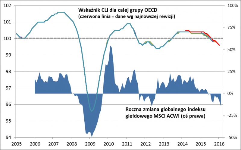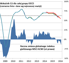 Inwestorzy giełdowi nie powinni jednak załamywać rąk z tego powodu. Zejście rocznej dynamiki globalnego indeksu MSCI ACWI do 14% poniżej zera w lutym sugeruje, że najnowsze sygnały wskaźników OECD - choć mogące dopiero zapowiadać nadchodzące gorsze twarde dane makro - zostały jednak pieczołowicie zdyskontowane przez inwestorów. Poprzednio taką dynamikę odnotowaliśmy w kwietniu 2012 r., co było spójne z równie kiepskimi odczytami CLI, co obecnie. Paradoksalnie moment odnotowania takiego "miksu" (niski poziom CLI + ujemna dynamika MSCI ACWI) nie tylko nie był dobrym momentem do sprzedawania akcji (to należało zrobić raczej w połowie 2011 r., kiedy CLI zaczynał dopiero spadać), ale wręcz przeciwnie - z perspektywy czasu widać, że była to raczej okazja do zakupów na zasadzie, że wiele złego było już w cenach akcji.