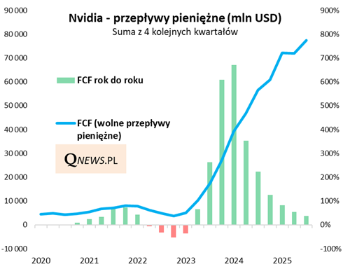 Często jako argument odróżniający obecną sytuację od tzw. bańki internetowej z przełomu wieków podaje się fakt, że obecne wielkie spółki technologiczne generują ogromny strumień gotówki. Niewątpliwie jest to prawda, jeśli chodzi o Nvidię. W ostatnim kwartale tzw. wolne przepływy pieniężne (FCF), czyli podstawowy parametr stosowany w wycenie spółek (to różnica między przepływami gotówki z działalności operacyjnej i tzw. CAPEX, czyli nakładów na środki trwałe), przekroczyły 77 miliardów dolarów (suma za 4 kwartały). Postęp przez ostatnie trzy lata jest tu ogromny - 16-krotny (!).