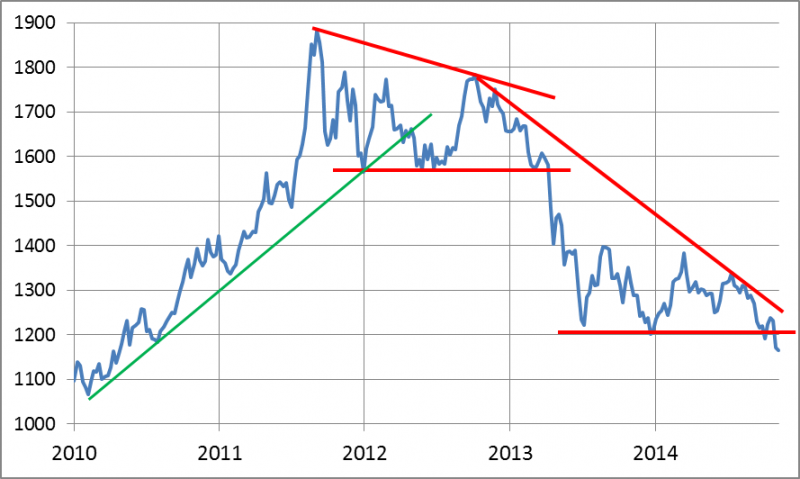 Były szef Fedu, Ben Bernanke ocenił kiedyś, że „nikt tak naprawdę nie rozumie zachowania cen złota”. Bez wątpienia sprawa nie jest prosta, ale nie oznacza to wszakże, że nie warto próbować. Ostatnie wydarzenia na rynku cennego kruszcu skłaniają do przemyśleń. Kurs kontraktów na złoto wybił się dołem z wielomiesięcznej konsolidacji podobnej do tej powstałej na przestrzeni 2012 roku. Analitycy techniczni w konsekwencji spodziewają się kolejnej fali spadkowej, która potencjalnie mogłaby sprowadzić notowania w okolicę 1000 USD za uncję. W ostatnich latach rynek złota wręcz książkowo poddawał się analizie technicznej, tak więc scenariusz taki warto brać pod uwagę.