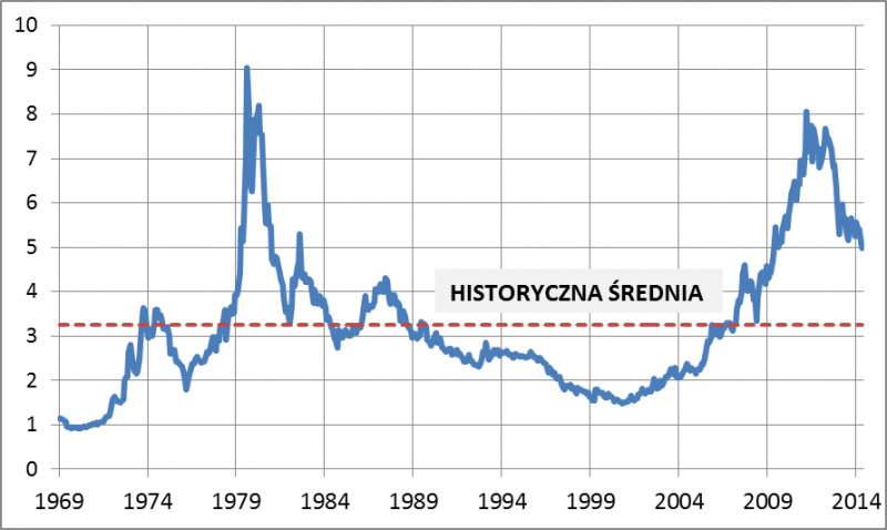 Problem polega jednak na tym, że o ile owa zależność w ostatnich kilkunastu latach jest bardzo silna, to wcześniej… nie istniała lub wręcz była odwrotna. Na przestrzeni lat 80-90. złoto powoli taniało przy jednoczesnym stopniowym spadku, a nie wzroście rentowności obligacji, zaś lata 70. były erą świetności kruszcu mimo wystrzału rentowności. Czy zatem widoczna w ostatnich kilkunastu latach ujemna korelacja jest zwykłym przypadkiem (korelacja jest zjawiskiem pozornym), a może swoistą samospełniającą się przepowiednią (skoro uczestnicy rynku zakładają, że taka zależność istnieje, to dostosowują do niej swe decyzje)?