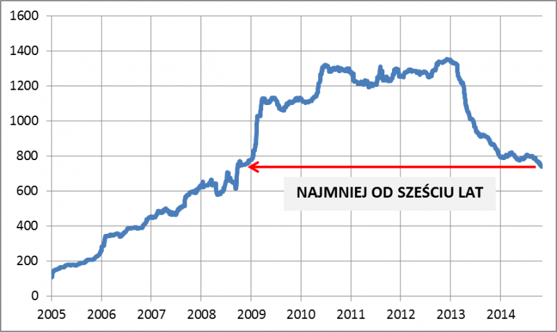 Ponieważ tak zdefiniowany kapitał spekulacyjny w dużym stopniu stał najpierw za napompowaniem bańki na rynku złota, a potem za wywołaniem turbulencji począwszy od 2013 r., można dojść do wniosku, że im mniej tego kapitału, tym zdrowsza sytuacja na tym rynku. Pod tym względem wszystko idzie w dobrym kierunku. W przypadku największego ETF (SPDR Gold Shares) zasoby kruszcu stopniały już niemal o połowę. To sprawia, że stopniowo maleje „siła rażenia” – pula potencjalnej podaży jest coraz mniejsza.