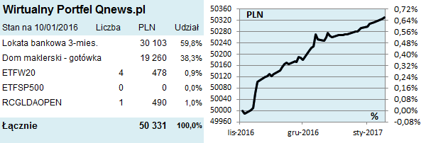 W naszym Wirtualnym Portfelu mamy już niewielką pozycję w złocie (z pewnym zastrzeżeniem - instrumenty RCGLDAOPEN dają ekspozycję na złoto w przeliczeniu na PLN; ekspozycję bezpośrednio na złoto w USD daje fundusz QUERCUS Gold). Choć nie mamy żadnej pewności co do tego czy poprawa koniunktury ma trwalszy charakter, to jednak decydujemy się nieco powiększyć pozycję ze względu na sygnały z rynku futures i szanse w postaci wzrostu inflacji. Na otwarciu środowej sesji dodamy do Portfela kolejne 2 instrumenty RCGLDAOPEN.