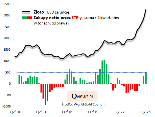 Najważniejszą wiadomością z raportu jest chyba dalsze ożywienie popytu ze strony funduszy typu ETF. Pod tym względem II kwartał br. był najlepszym drugim kwartałem od stojącego pod znakiem pandemii 2020 roku. W samym II kwartale ETF-y kupiły netto ponad 170 ton złota, zaś w czterech kolejnych kwartałach saldo przekroczyło 510 ton.