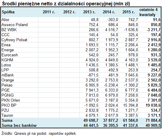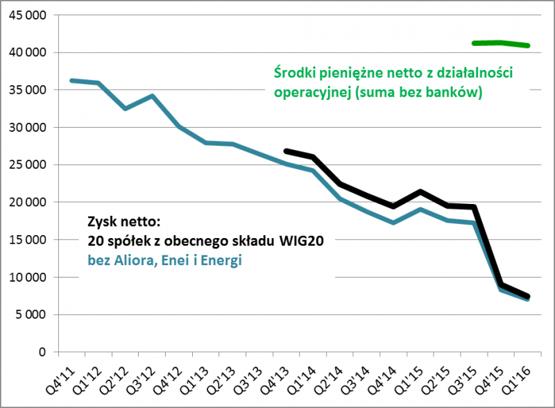 Jeśli zaś chodzi o strumienie gotówki, to sytuacja wygląda o niebo lepiej. W ostatnich czterech kwartałach spółki z WIG20 „wyprodukowały” łącznie prawie 72 mld zł gotówki netto z działalności operacyjnej (ang. operating cash flow). Nawet jeśli z kwoty tej wyeliminujemy przepływy pieniężne w bankach (gdzie mają one specyficzny charakter), to i tak pozostanie jeszcze prawie 41 mld zł – tyle gotówki wygenerowały w ostatnich czterech kwartałach niebankowe spółki z WIG20 z tytułu działalności operacyjnej. To kwota nieporównywalna z mizernymi zyskami na poziomie 7,4 mld zł.