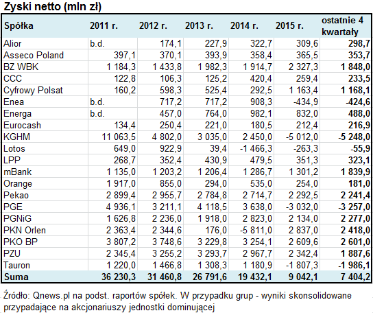 Zła wiadomość jest taka, że – choć I kwartał nie był aż tak dramatyczny jak IV kw. ub.r. (gdy część spółek, np. energetycznych, szokowała wielomiliardowymi odpisami z tytułu utraty wartości aktywów) – to jednak przyniósł dalszy regres. Suma zysków z 4 kwartałów stopniała do 7,4 mld zł, co jest poziomem najniższym od co najmniej pięciu lat. Czy ktoś pamięta jeszcze czasy, gdy ta sama grupa spółek raportowała zarobki netto przekraczające 30 mld zł w skali czterech kwartałów?