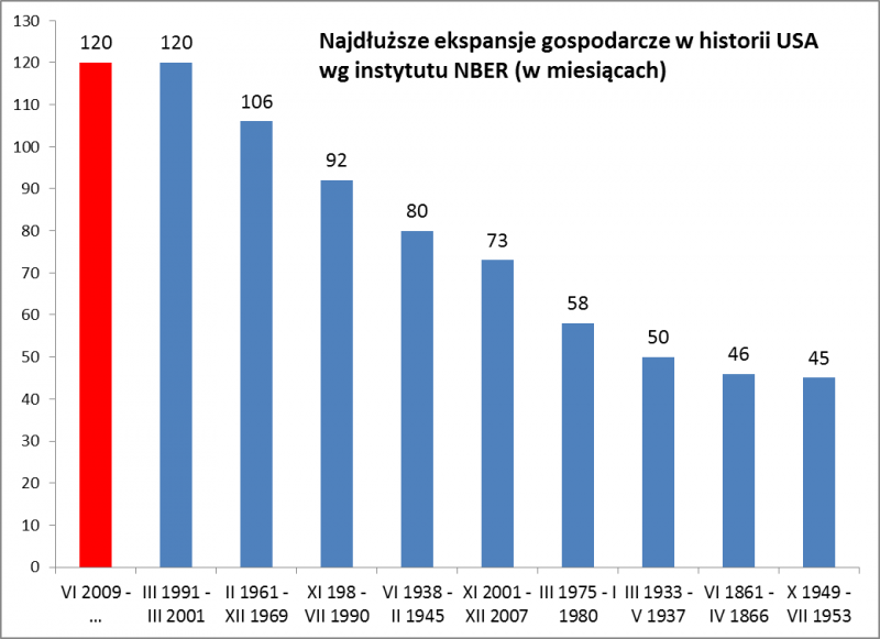 Według oficjalnej chronologii stosowanej przez amerykański instytut NBER (National Bureau of Economic Research) w maju mija 120 miesięcy od momentu rozpoczęcia obecnej ekspansji gospodarczej (dołek wyznaczono na czerwiec 2009). Tymczasem dla porównania najdłuższa do tej pory ekspansja, zakończona w marcu 2001 roku trwała … 120 miesięcy. Innymi słowy jesteśmy o krok od ustanowienia nowego rekordu ekspansji. Nie mówiąc już o tym, że obecna faza wzrostowa trwająca od dziesięciu lat (!) dwukrotnie przewyższa powojenną średnią wynoszącą 58,4 miesiąca (czyli niecałe pięć lat).