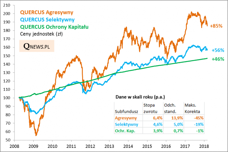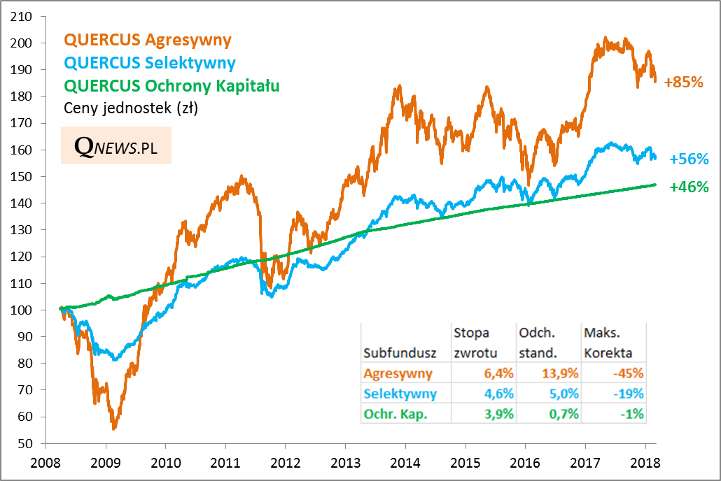 Porzućmy przynajmniej na chwilę bieżące rozważania i spójrzmy na długoterminowe stopy zwrotu. Okazja jest o tyle dobra, że w marcu mija dziesięć lat od uruchomienia najstarszych subfunduszy QUERCUS: Agresywnego, Selektywnego i Ochrony Kapitału. Oto jak ich notowania wyglądają na przestrzeni lat.