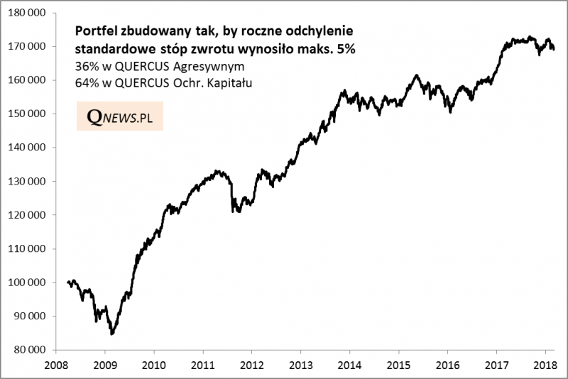 Weźmy pod lupę przykładowo portfel, który ma być zbudowany tak, by odchylenie standardowe wynosiło 5%, czyli by zmienność była na umiarkowanym, akceptowalnym zapewne dla znacznej rzeszy inwestorów poziomie. Nasz symulator "wypluł" na podstawie historycznych danych następujące wagi: 36% portfela w QUERCUS Agresywnym i 64% w QUERCUS Ochrony Kapitału. Oto jak wyglądałaby linia kapitału, gdyby na początku zainwestować 100 tys. zł (a potem co roku dokonywać rebalancingu).