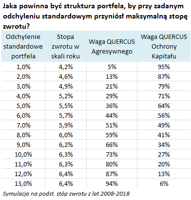 Na koniec zastrzeżenie. Nie należy historycznych danych traktować jako "wyroczni". Przykładowo historyczne stopy zwrotu z QUERCUS Ochrony Kapitału były wyraźnie wyższe od bieżącej rentowności obligacji i stóp procentowych, co mogłoby sugerować, że faktyczne wagi tego bezpiecznego funduszu w portfelu powinny być niższe, niż wynikałoby z symulacji opartej wyłącznie na przeszłych danych.