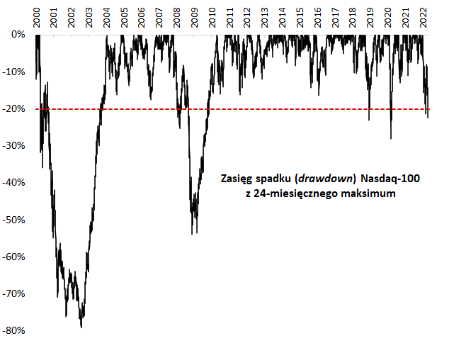 Ostatni tydzień kwietnia przyniósł wymowny sygnał w segmencie spółek technologicznych na Wall Street. Indeks Nasdaq-100, znany z korporacji-gigantów, takich jak Apple, Microsoft, Amazon, Tesla czy Alphabet, zaliczył przeszło 20-proc. spadek od szczytu hossy (odnotowanego w końcówce grudnia ub.r.). Według popularnego, medialnego kryterium oznacza to przekroczenie formalnego progu bessy. Natomiast fakty historyczne prowadzą do konkluzji, że „na dwoje babka wróżyła” – ani nie gwarantują nadejścia wielomiesięcznego rynku niedźwiedzia (w ostatnich dwóch przypadkach Nasdaq powiększył skalę przeceny maksymalnie do -28 proc. i -23 proc.), ani też nie gwarantują, że jest to już super okazja do zakupów (patrz – bessy z lat 2008 i 2000-02). Wskazana jest chyba ostrożność, bo wyśrubowanym wycenom spółek technologicznych nie służą choćby wyższe stopy procentowe.