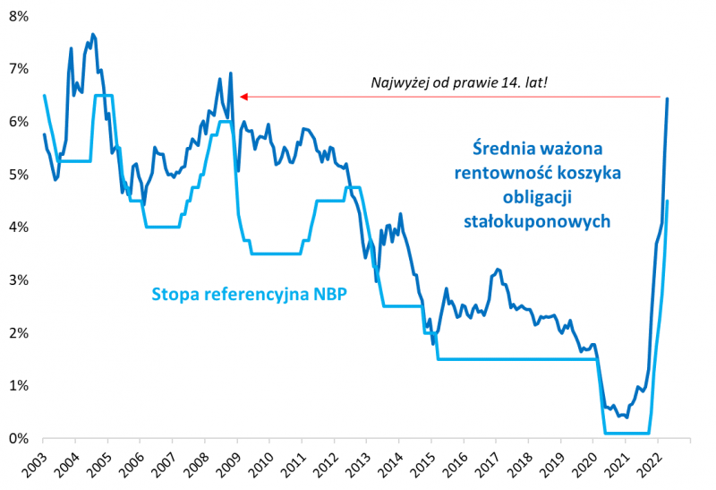 Kwiecień przyniósł kontynuację trendu wzrostowego rentowności obligacji skarbowych pod wpływem oczekiwań na dalsze podwyżki stóp. Średnia ważona rentowność papierów stałokuponowych podawana przez Bloomberg zawędrowała powyżej 6 proc. w skali roku – do poziomu najwyższego od … prawie 14. lat. Można zakładać, że obligacje będą coraz bardziej łakomym kąskiem dla wytrwanych inwestorów, szczególnie że banki komercyjne nie spieszą się z podnoszeniem oprocentowania depozytów.