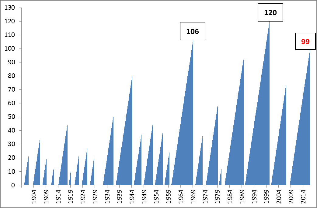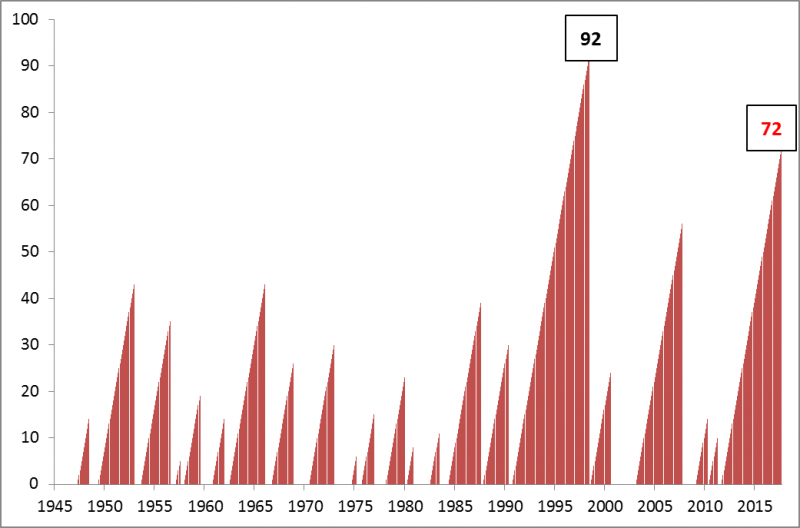 Okazuje się, że w przytłaczającej większości przypadków okresy bez recesji były dużo krótsze, niż ten obecny, trwający od 2009 roku. A innymi słowy, ten obecny należy już do rekordowo długich. Dłuższe były tylko dwa: w latach 1991-2001 (aż 120 miesięcy) oraz w latach 1961-69 (106 miesięcy). Do tego drugiego brakuje już naprawdę niewiele (7 miesięcy licząc od końca września). W przypadku rekordowej serii z lat 90. dystans jest większy i wynosi 21 miesięcy. Gdyby tamten rekord miał zostać wyrównany, to kolejna recesja powinna rozpocząć się w … lipcu 2019 roku. Należy to rozumieć jako termin maksymalny z punktu widzenia historycznych statystyk.