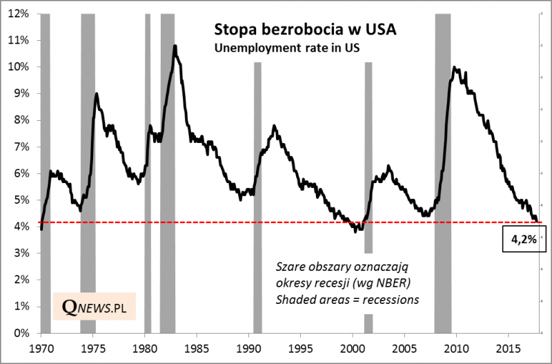 W tym roku wręcz roi się od rozmaitych rocznic rynkowo-gospodarczych. Dziesięć lat od rekordu WIG-u, dwadzieścia lat od kryzysu azjatyckiego, trzydzieści od krachu w 1987 roku… Do tej kolekcji dodać można kolejny zauważony przez nas fakt – październik jest setnym miesiącem od zakończenia ostatniej oficjalnej recesji w USA (według instytutu NBER), czyli od czerwca 2009 roku. A pamiętajmy, że tamta recesja dotyczyła nie tylko Ameryki – błyskawicznie rozlała się po całym świecie (u nas doszło do głębokiego spowolnienia i wzrostu bezrobocia). Co ciekawe ta okrągła rocznica zbiega się w czasie ze spadkiem stopy bezrobocia za oceanem do poziomu najniższego od ... 2000 roku.