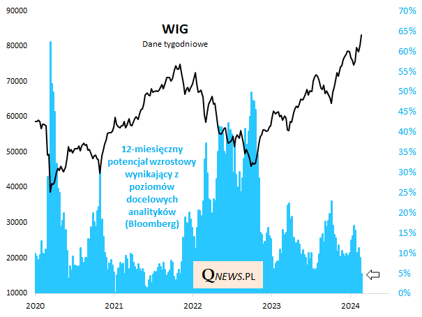 Na razie, po ostatniej dynamicznej zwyżce WIG-u potencjał wynikający z szacunków analityków nie wygląda zbyt imponująco. W ubiegłym tygodniu skurczył się poniżej progu 5 proc. Nie musi to być sygnał rynkowego szczytu (czasem potencjał spadał jeszcze niżej, niewykluczone też, że analitycy zaczną podnosić swoje poziomy docelowe), ale trudno też mówić obecnie o szczególnej okazji. Będziemy trzymać rękę na pulsie.