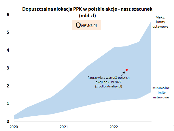 W kuluarach rynkowych mówi się o coraz większym popycie "pęczniejących" PPK na polskie akcje. Na podstawie naszej analizy ustawowych limitów dotyczących poszczególnych kategorii czasowych PPK (te o najkrótszym horyzoncie czasowym, czyli PPK 2025, muszą mieć mocno ograniczoną alokację w akcje, zaś te o najdłuższym, np. PPK 2065, mogą w akcjach ulokować maksymalnie nawet 64 proc. portfeli) można orientacyjnie szacować jaka jest zagregowana dopuszczalna alokacja. Obecnie szacujemy ją między 1,6 i 5,6 mld zł - rzeczywisty poziom jest zapewne gdzieś powyżej środka tego przedziału. Dla porównania, we wrześniu ub.r. Analizy.pl informowały, że PPK miały ulokowane 2,9 mld zł w akcjach z GPW na koniec półrocza (od tego czasu ich całe aktywa urosły o 3 mld zł).