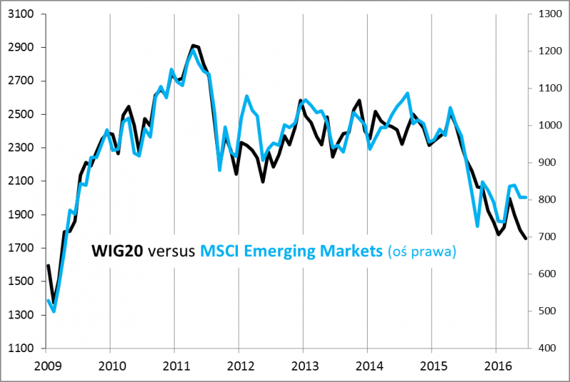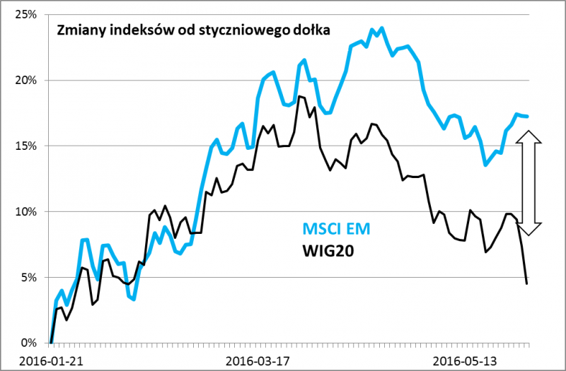 Polityka nie przestaje pogrążać cen akcji na GPW. Plotki na temat nacjonalizacji aktywów OFE - to kolejny element przyczyniający się do kryzysu zaufania wśród inwestorów. Dowodem na to jest bardzo słabe zachowanie polskiego rynku akcji na tle rynków wschodzących (emerging markets), z którymi łączy nas zwykle silna korelacja.