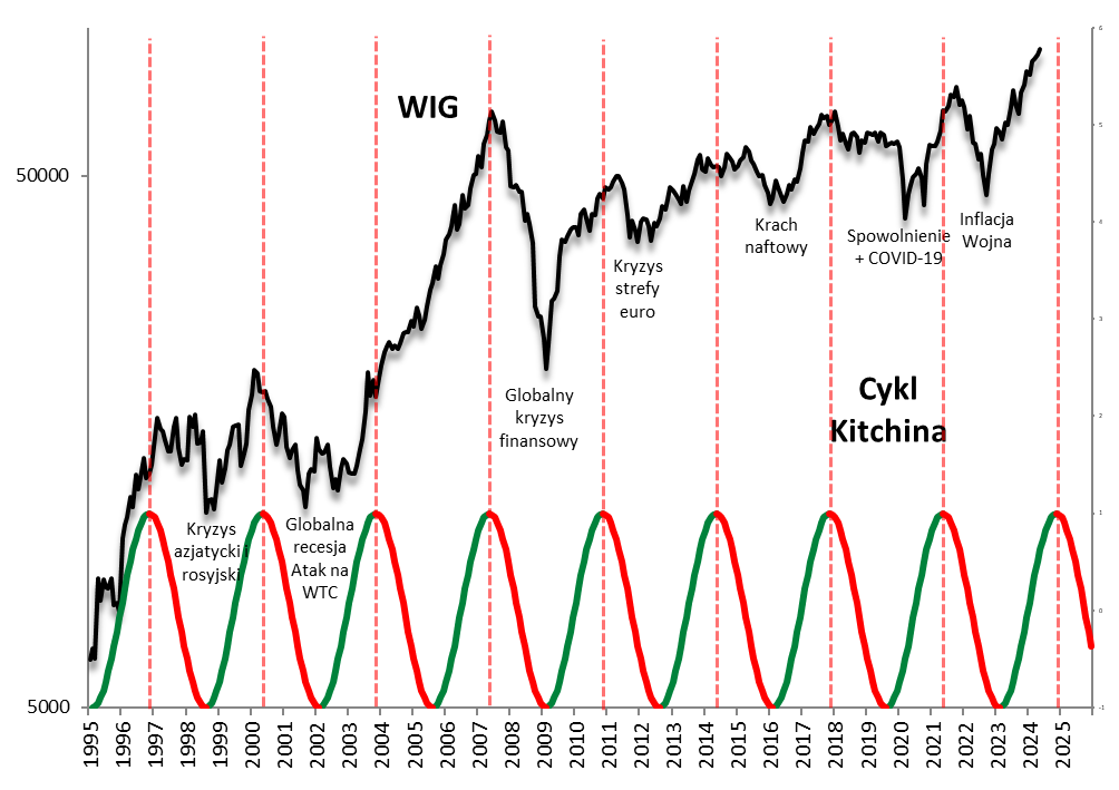 Można ogólnie podsumować, że nasza wersja cyklu Kitchina (nieco zmodyfikowana względem oryginału, bo w obliczeniach zakładamy 21, a nie 20 miesięcy) nie zawsze przynosiła przysłowiowy strzał w dziesiątkę, jeśli chodzi o terminy poszczególnych szczytów, ale całokształt wygląda dość zachęcająco. Co prawda ostatni szczyt hossy (X 2021 wg danych miesięcznych) ukształtował się ostatecznie 5 miesięcy po teoretycznym terminie (a WIG urósł przez ten czas jeszcze o 11 proc.), ale było to akurat jedno z dłuższych odchyleń od normy. Szczyty z lat 2018, 2007 czy 2000 ukształtowały się niemal idealnie w okolicy wyznaczonej przez teoretyczny przebieg cyklu.
