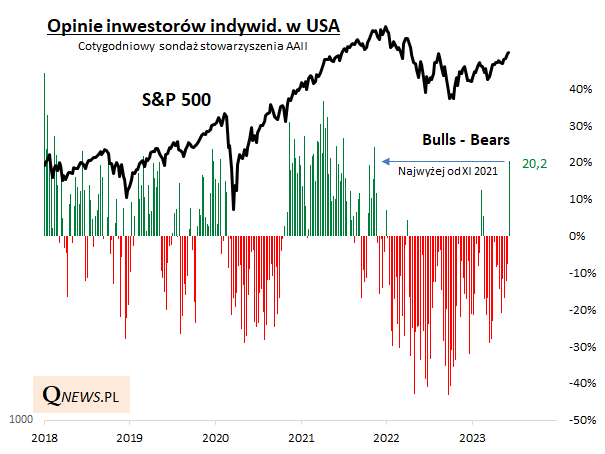 W tle obserwujemy stopniowe ocieplenie nastrojów ("sentymentu") inwestorów. W sondażu Amerykańskiego Stowarzyszenia Inwestorów Indywidualnych (AAII), w którym od miesięcy panował pesymizm, sytuacja uległa gwałtownej zmianie - różnica między odsetkiem "byków" i "niedźwiedzi" nagle znalazła się mocno na plusie (+20,2 pkt. proc.), na poziomie najwyższym od listopada 2021. To zapewne pokłosie przekroczenia 20-proc. progu zwyżki przez S&P 500.