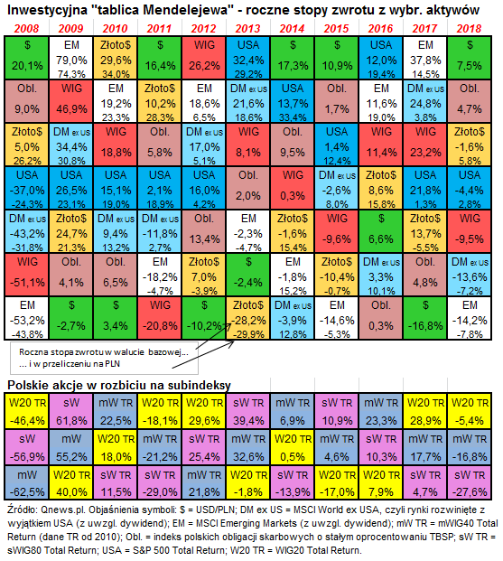 W naszej inwestycyjnej „tablicy Mendelejewa” w oczy rzuca się jeszcze jedna kwestia. Nie tylko jeśli chodzi o pozycję dolara i rynków wschodzących zakończony 2018 rok bardzo przypomina rok … 2008. Niemal identyczny jest układ całego rankingu (z wyjątkiem WIG i rynków rozwiniętych poza USA, które zamieniły się miejscami). Nasuwa się tu pewne kontrowersyjne przypuszczenie. Skoro rok 2018 wyglądał jak 2008 (a 2017 w niemałym stopniu jak 2007 – choć tego nie widać już w naszej tabeli), to kto wie czy przynajmniej jeśli chodzi o kolejność w rankingu rok 2019 nie będzie wyglądał jak rok 2009, który jak pamiętamy był bardzo udany dla rynków akcji?