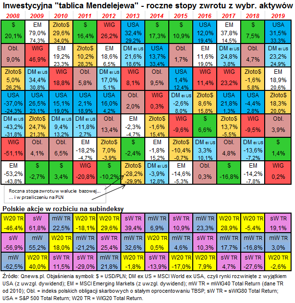 Czy jakiejś reguły można dopatrzyć się jeśli chodzi o rynki wschodzące? Przypomnijmy, że w 2018 roku emerging markets były na samym końcu rankingu. W poprzednich przypadkach kiedy to się zdarzyło (2015, 2008), w kolejnych dwóch latach rynki wschodzące były w okolicach czołówki naszego zestawienia. Gdyby ta „reguła” miała nadal obowiązywać, to po udanym 2019 roku należałoby też oczekiwać udanego 2020 roku (o ile w ogóle można tu mówić o regule – ze statystycznego punktu widzenia dwa historyczne przypadki to bardzo mało do snucia wiarygodnych wniosków).