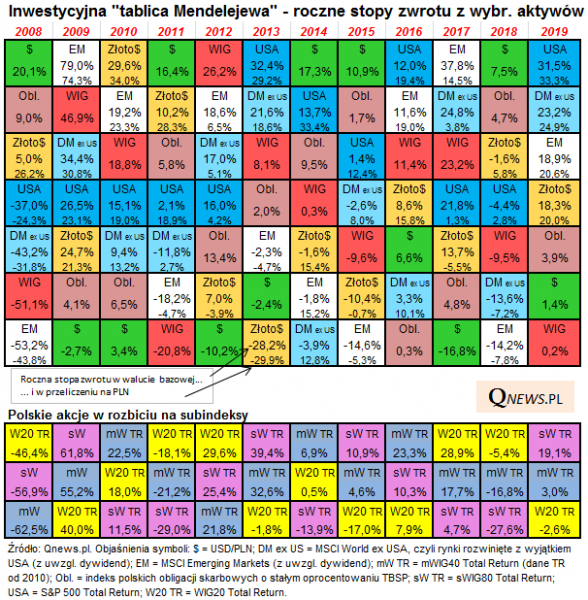 O ile rok 2018 był słaby dla tzw. ryzykownych aktywów, czyli akcji z różnych rynków i udany dla typowo defensywnych, to 2019 był … mniej lub bardziej udany dla wszystkich aktywów z naszej głównej tabeli.