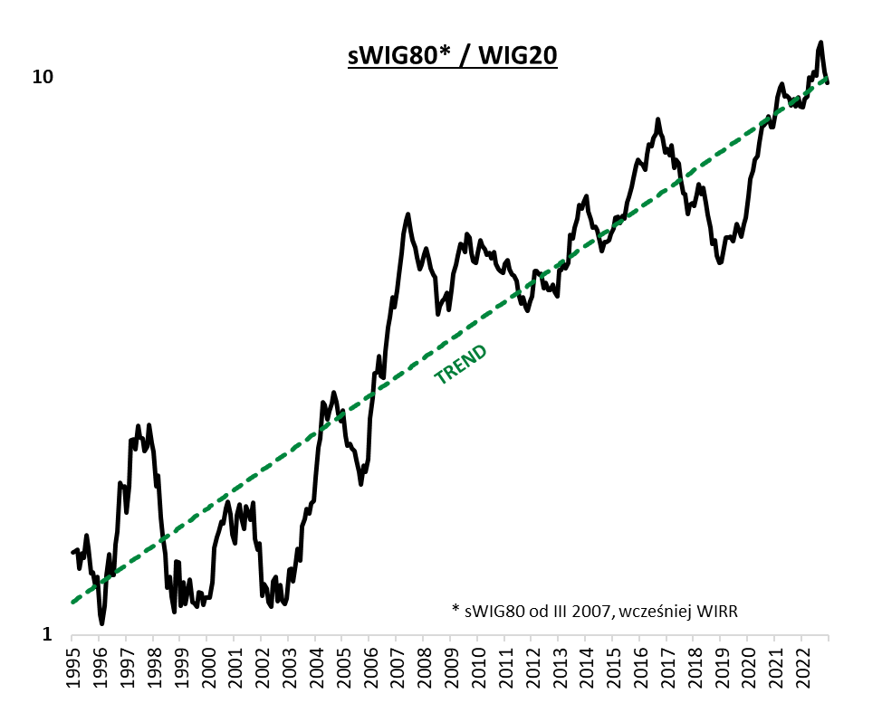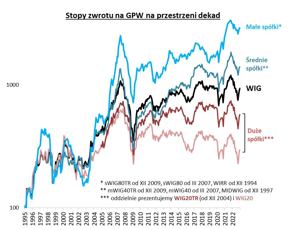 Reasumując, 2022 rok ugruntował długoterminową przewagę indeksu małych spółek, szczególnie nad WIG20. Pośrodku stawki plasuje się indeks średnich spółek mWIG40.