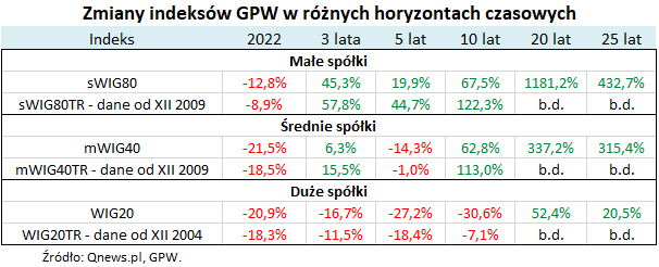 Przy okazji omawiania inwestycyjnej „tablicy Mendelejewa” ze stopami zwrotu w 2022 roku dotknęliśmy już co prawda tematu rocznych zmian poszczególnych indeksów GPW, ale warto ten temat pogłębić, przyglądając się również bardziej długoterminowym rezultatom i zależnościom.