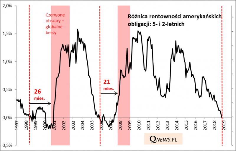 Analiza poprzednich dwóch przypadków pokazuje, że od omawianego sygnału (rentowność 5-latek poniżej rentown. 2-latek) mijało 21-26 miesięcy do rozpoczęcia bessy z prawdziwego zdarzenia.