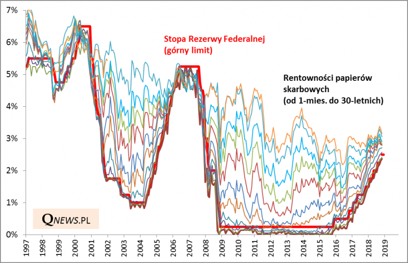 Dlaczego głębokie odwrócenie krzywej rentowności w USA (z którym na razie nie mamy do czynienia) było historycznie trafnym sygnałem ostrzegawczym? Według najprostszej teorii spadek rentowności długoterminowych obligacji poniżej krótkoterminowych (które są kształtowane głównie przez Fed) oznaczał, że rynek w całej swej mądrości oczekiwał trafnie, że w przyszłości Fed będzie musiał obniżyć stopy procentowe, np. na skutek recesji. Co ciekawe takie wytłumaczenie było zwykle bagatelizowane przez decydentów.