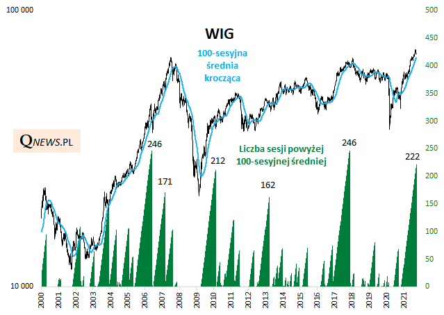 Jak to wygląda w kontekście historycznym? Okazuje się, że dokładnie 222 sesje, jakie wczoraj upłynęły od wejścia WIG-u powyżej 100-sesyjnej średniej, to trzeci najlepszy wynik na przestrzeni ponad dwóch dekad. Dłużej ponad omawianą linią WIG utrzymywał się tylko w latach 2017 i 2006 - w obu tych przypadkach długość pobytu wyniosła 246 dni handlowych.