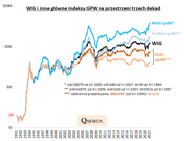 Reasumując, w pierwszych trzech dekadach funkcjonowania GPW zarysowała się wyraźna hierarchia stóp zwrotu. Najwyższe przyniosły małe spółki, pośrodku stawki uplasowały się średnie firmy, a na końcu rankingu znalazły się największe (WIG20).