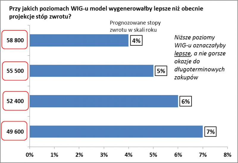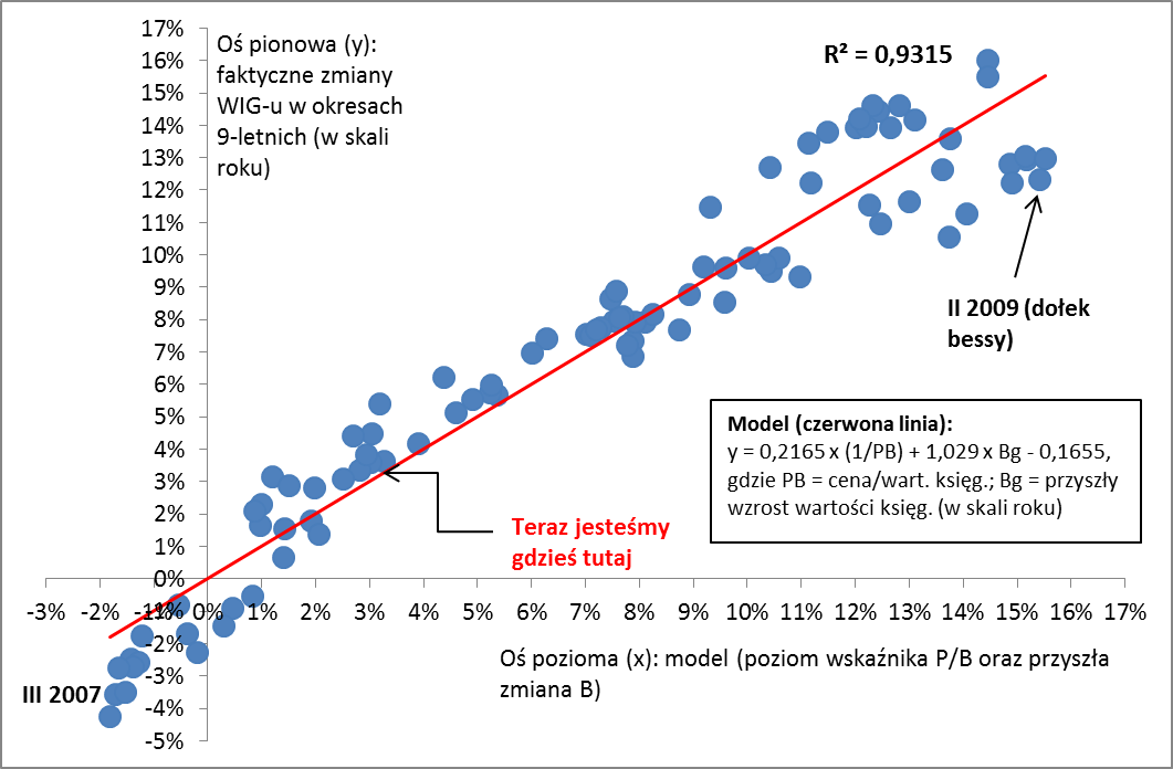 Taki wynik wygenerował prosty model matematyczny bazujący na obserwacji, że w przeszłości długoterminowe stopy zwrotu z WIG-u zależały w niemal całości od dwóch czynników: (a) poziomu wskaźnika cena/wartość księgowa, (b) wzrostu wartości księgowej.