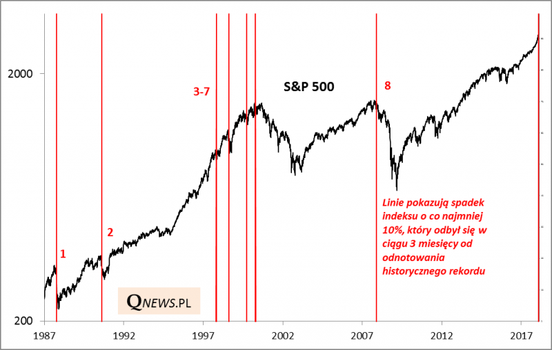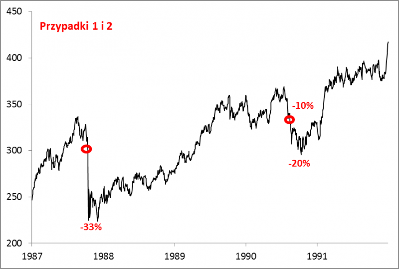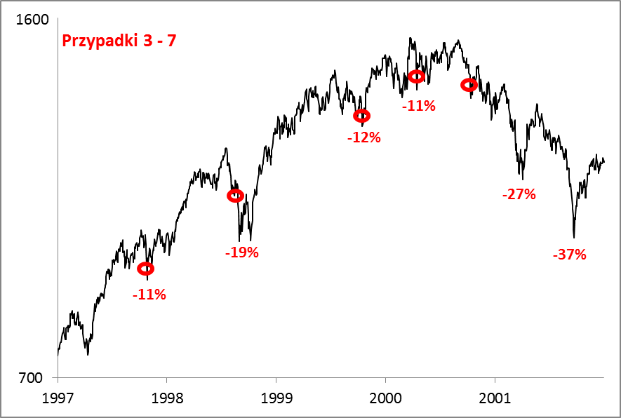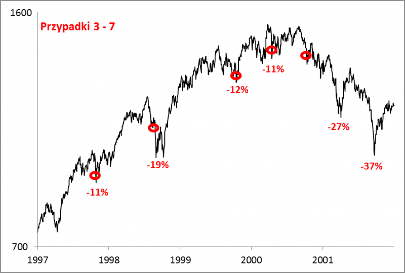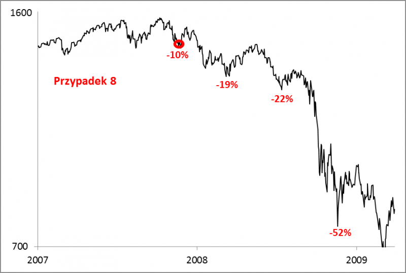 Pierwsze co zwraca uwagę, to fakt, że nie zawsze 10-proc. spadek całkowicie wyczerpywał atak podażowy. W przypadkach takich jak na jesieni 1987 czy też w 1990 roku przecena była jeszcze głębsza. Ogółem spośród ośmiu omawianych przypadków w trzech (38%) szybka wyprzedaż postępowała nadal. Ale były też przypadki, w których indeks jak gdyby nigdy nic miał zacząć się niebawem zabierać za powrót do szczytów trendu wzrostowego - takich było również trzy (38%). Co ciekawe dwa z nich miały miejsce w ostatnim etapie bańki internetowej (1999-2000). Zdecydowanie najgorsze były przypadki z jesieni 2007 oraz połowy 2000 - co prawda na krótką metę nadeszło odreagowanie, ale w ostatecznym rozrachunku był to dopiero wstęp do bessy.