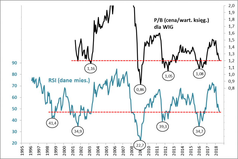 - wyceny mierzone wskaźnikiem P/B byłyby już na poziomach dołków z lat 2012 i 2016,