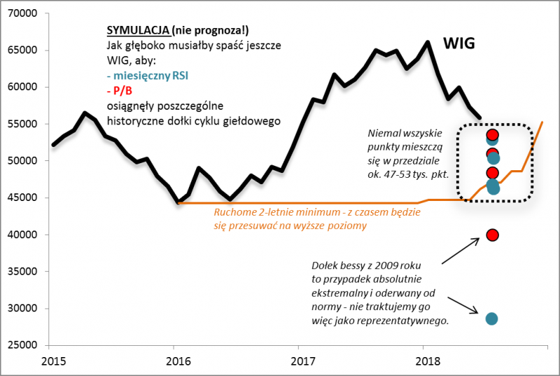 Przejdźmy dalej w tych rozważaniach do kolejnego elementu. Na cykl giełdowy spoglądamy często przez pryzmat naszego ulubionego wskaźnika technicznego – RSI (w wersji opartej na danych miesięcznych). Przy jakich poziomach tego oscylatora dobiegały końca cykliczne fale spadkowe WIG-u? W najbardziej katastroficznym przypadku (początek 2009 roku) RSI zszedł aż do 22,6 pkt. Ale to przypadek zdecydowanie oderwany od normy, bo wszystkie pozostałe cztery przypadki uplasowały się w rejonie 34,7-41,4 pkt. Dla porównania, obecnie oscylator jest na poziomie poniżej 50 pkt. Pokusiliśmy się o prostą symulację. O ile musiałby jeszcze spaść WIG, by RSI znalazł się w rejonie typowym dla większości historycznych dołków? Wychodzi na to, że dołka cyklu należałoby szukać w strefie ok. 47-55 tys. pkt. Te wyniki ciekawie komponują się z wcześniejszymi obliczeniami dotyczącymi 2-letniego minimum.